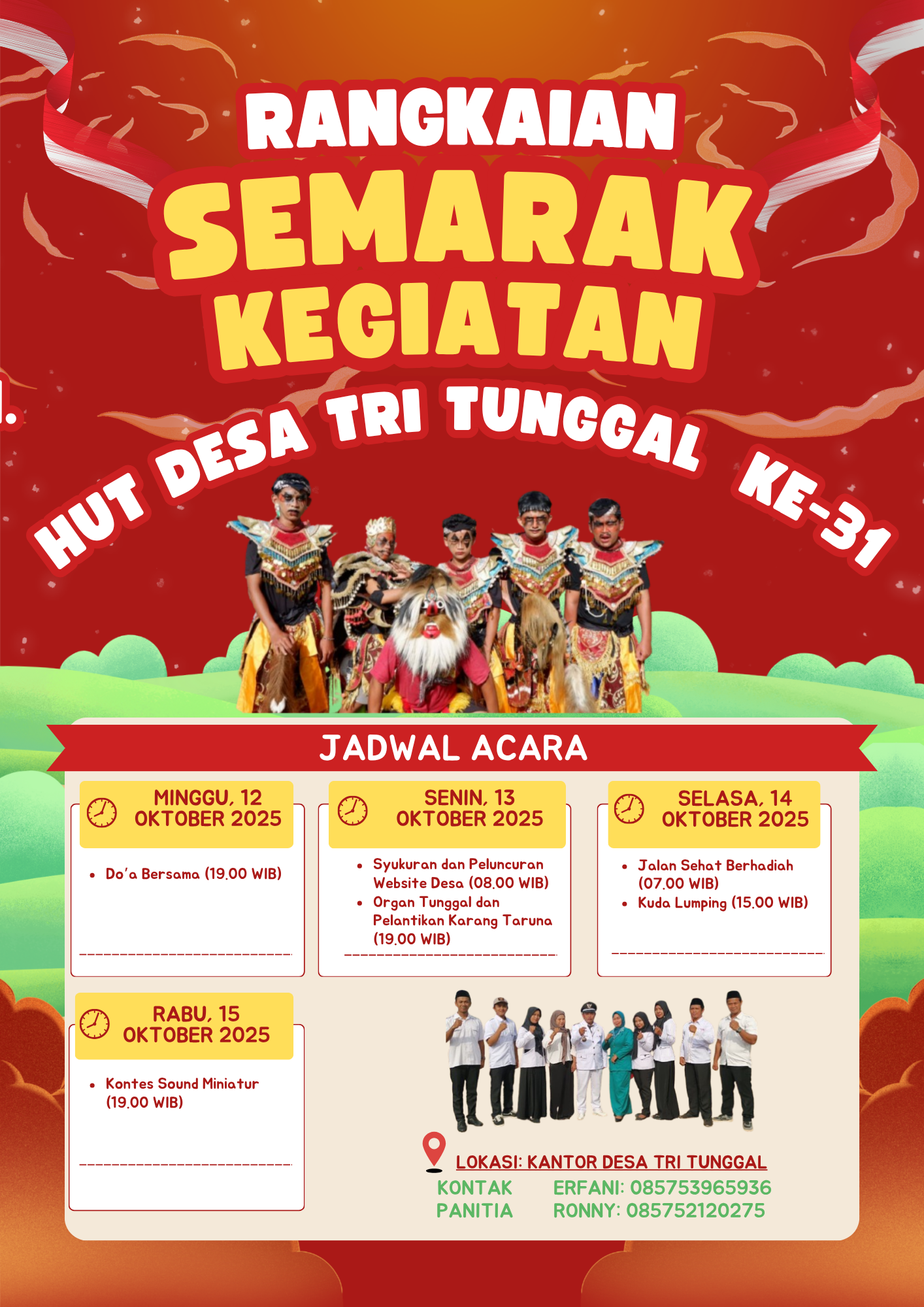 Pemerintah Desa Tri Tunggal mengundang seluruh warga untuk mengikuti rangkaian HUT Desa Tri Tunggal ke-31 di Halaman Kantor Desa Tri Tunggal mulai tanggal 12 s/d 15 Oktober 2025. Selengkapnya